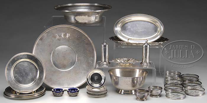 36-PIECES OF STERLING TABLEWARES. Lot consisting of: 1) 2-1/2″ h x 9-1/2″ dia. bowl by S. Kirk & Son, Inc. marked “4106”. Edge of bowl monogrammed. 2) 10-1/4″ round underliner/tray by W.H. Manchester & Co. Monogrammed on rim and marked “884” on bottom. 3) 3-1/4″ x 6-1/4″ dia. Revere bowl by Watson Co. Bottom marked “A999 Exemplar Paul Revere”, 1768″. Monogrammed. 4) 10″ x 7″ “Chippendale” tray by Frank W. Smith Silver, Inc. 5) Three S. Kirk & Son Inc. sterling 6″ plates monogrammed. 6) Two 6″ International plates, monogrammed. 7) 6-1/4″ Gorham plate. 8) Ten 3″ dia. plates with monogram by Stone Sterling Silver Co. 9) Seven cut glass & sterling coasters. 10) Two pair of salt & peppers by Rogers Lunt & Bowlen Co. And two cobalt lined open salts, a salt spoon and two small dishes. WEIGHT: 82 tr. oz. CONDITION: Generally good, items show use, no major flaws. 9-22617 (2,000-3,000)