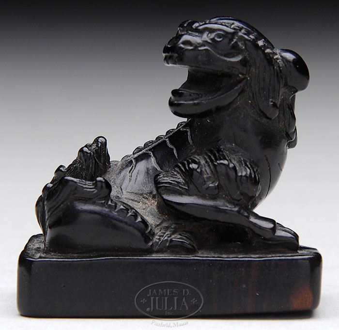CARVED EBONY NETSUKE. 18th century, Japan. Carved in the form of a shishi on a rectangular base. SIZE: 1-3/4” h. CONDITION: Very good with dark patina. 9-27123 (500-800)