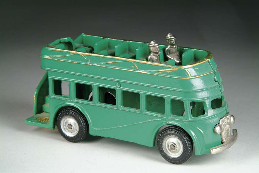 LATER ARCADE DOUBLE DECKER BUS. A late 30’s early 40’s streamlined bus with nickel-plated passengers riding on upper floor. Bus feature original “Arcade” sticker, black rubber tires and nickel –plated grill & bumper. SIZE: 7-1/2” l. CONDITION: Overall condition near mint. JL 1-3910 (500-600) Auction: Advertising, Toy & Doll - Spring 2005 Please Note: All prices include the hammer price plus the buyer’s premium, which is paid by the buyer as part of the purchase price. The prices noted here after the auction are considered unofficial and do not become official until after the 46th day. |