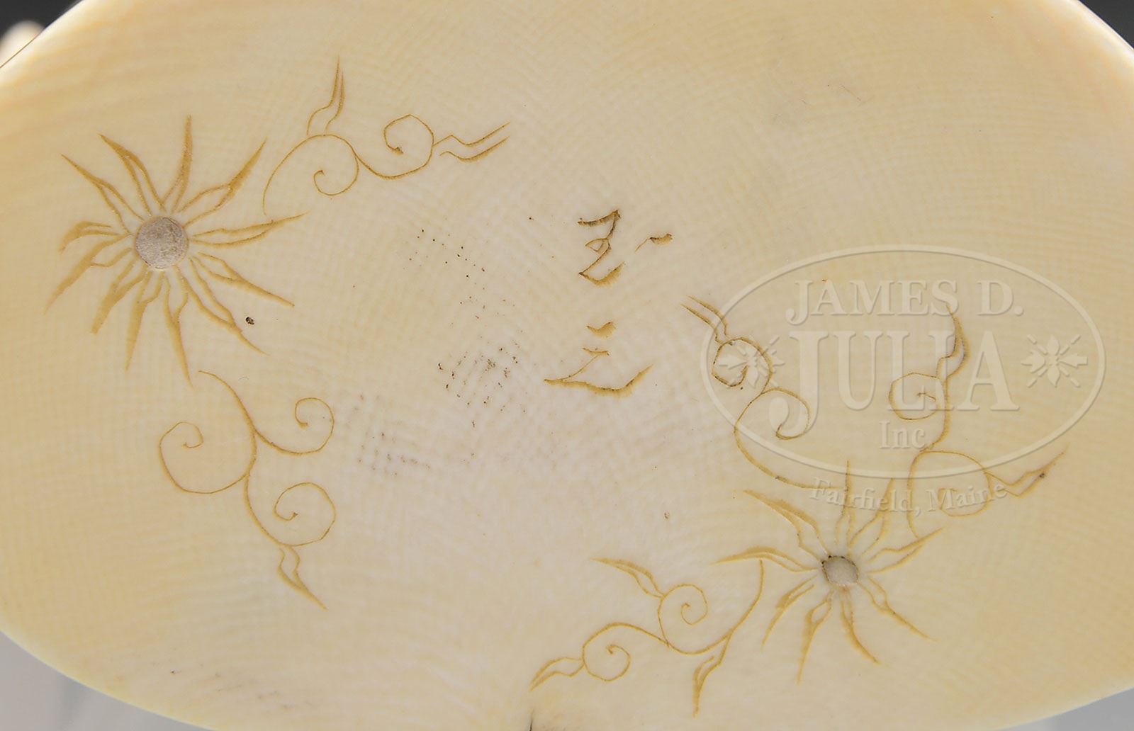 IVORY CARVING. 19th century, Japan. Scene of two vendors. Signed on base. SIZE: 5-1/4″ h. CONDITION: Very good with minor loss. 9-29276 (300-500)