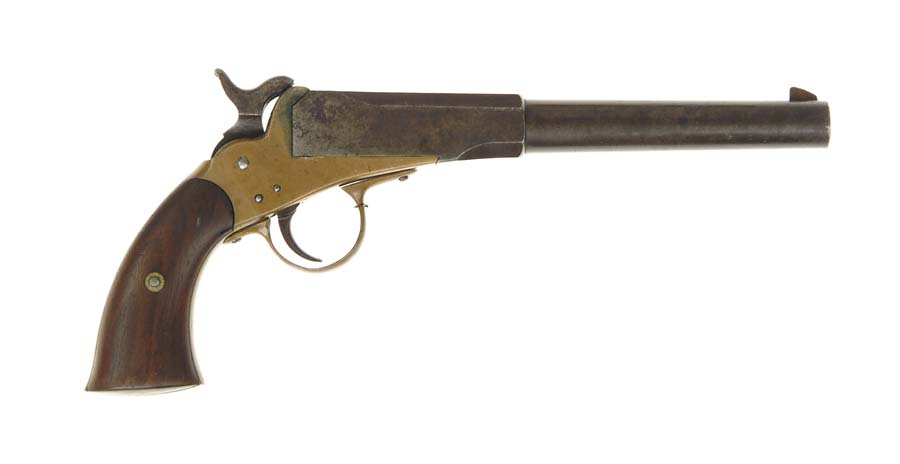 LINDSAY COMMERCIAL MARTIAL SIZED TWO SHOT PISTOL. SN 114. .42 cal. smooth bore. 8-1/2” part oct bbl. Marked “LINDSAY’S / YOUNG – AMERICA / PATENT’D.OCT. 9. 1860” on top of the bbl. CONDITION: Gray/brown patina mixed with surface rust and pitting. Frame has a dark patina with moderate green patina at the top. Grips have been cleaned but not refinished. Mechanically fine. 4-54504 FS141 (2,500-3,500)