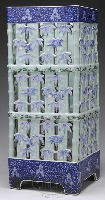 PORCELAIN UMBRELLA STAND. Late 19th, early 20th century, Japan. Arita ware. Molded as a bamboo fence. Decoration of birds and floral scroll in underglaze blue with areas of celadon enhanced with pink and green enamel. SIZE: 24″ h. CONDITION: Very good. 9-26305 (800-1,200)