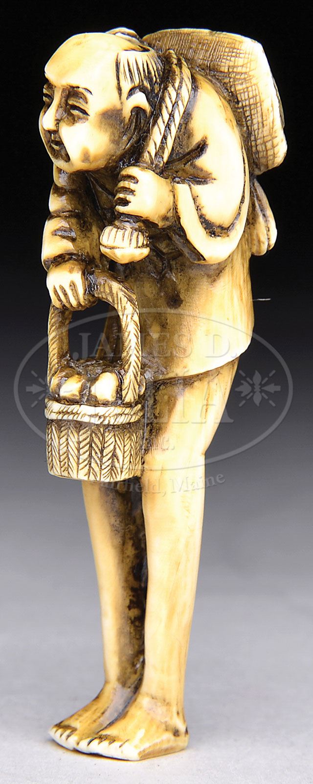 IVORY NETSUKE. 19th century, Japan. Figure of Ashinaga holding a basket. Signed on back. SIZE: 2-3/4″ l. CONDITION: Very good. 7-74001 (200-300)