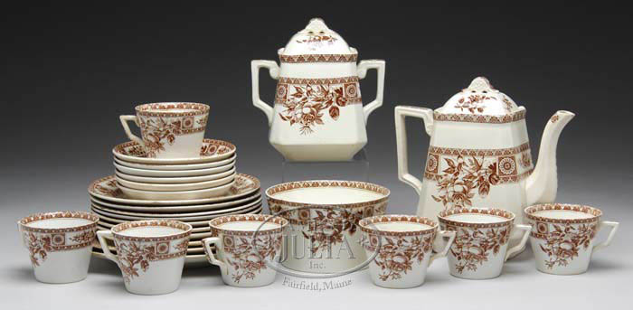 TWENTY-SIX PIECE STAFFORDSHIRE PARTIAL DINNER SERVICE IN “GARFIELD” PATTERN. The Staffordshire brown decorated set marked on bottom “L.S.& S”. Set consists of: covered teapot; covered sugar; waste bowl; seven handled cups; six saucers; eight 8” plates; two 10” plates. CONDITION: Hairlines and discoloration. Fair. 9-74013 (150-250)