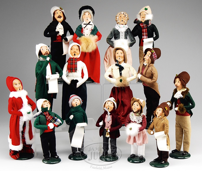 FIFTEEN CAROLER FIGURES BY BYERS CHOICE, LTD. Eleven marked “The Carolers”, the other just marked “Byers Choice LTD”. All dated between 1981 and 1992. SIZE: Range from 9″ to 13″. PROVENANCE: Collection of Elwyn Dearborn, Medford, NJ & Portland, ME. CONDITION: Very good. 9-96392 (200-400)