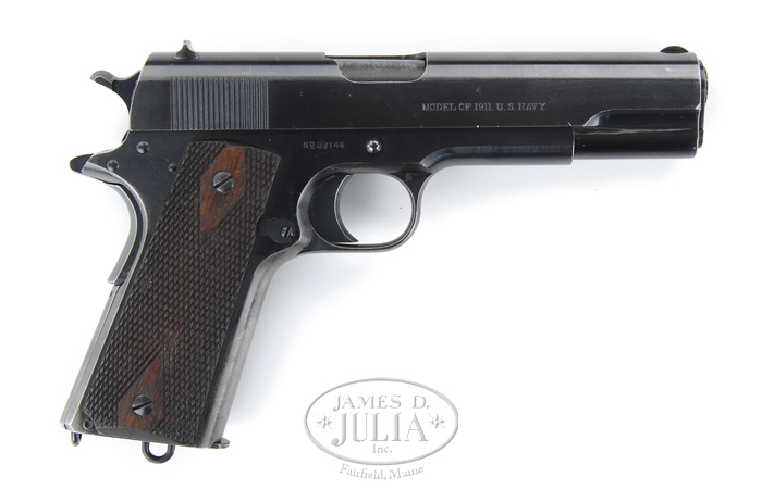 *COLT MODEL 1911 US NAVY SEMI-AUTO MILITARY PISTOL. SN 38144. Cal. 45 ACP. 1913 Navy contract 1911 pistol with 5″ bbl having the “H” & “P” proofs on the skirt perpendicular to the bore. Slide has usual markings with the last patent date being 1911. Right side of slide is marked “MODEL 1911 U.S. NAVY”. The rear sight is of the flat top variety, not the rounded type. Left front side of frame has “UNITED STATES PROPERTY” with the “WGP” inspector mark for Major Walter G. Penfield and serial number is above trigger opening on right side. There is a small “5” in right front web of trigger guard. Accompanied by one 2-tone lanyard loop magazine. These pistols were almost immediately put into service, generally aboard ship and saw service throughout World Wars I & II and are rarely found to have survived with much orig finish. CONDITION: Very fine. Slide retains 95-97% strong bright orig charcoal blue with only slight muzzle & sharp edge wear. Frame retains most of its strong bright orig blue on the sides & front with trigger guard also very strong. Front strap retains about 50-60% thin orig blue with the mainspring housing & grip safety retaining about 80% thin orig blue. Grips are sound with a few chipped diamonds showing moderate wear, especially on right side. Magazine is dark with a medium brown patina on the white area. Mechanics are fine, bright shiny bore. 4-32981 (6,000-10,000)