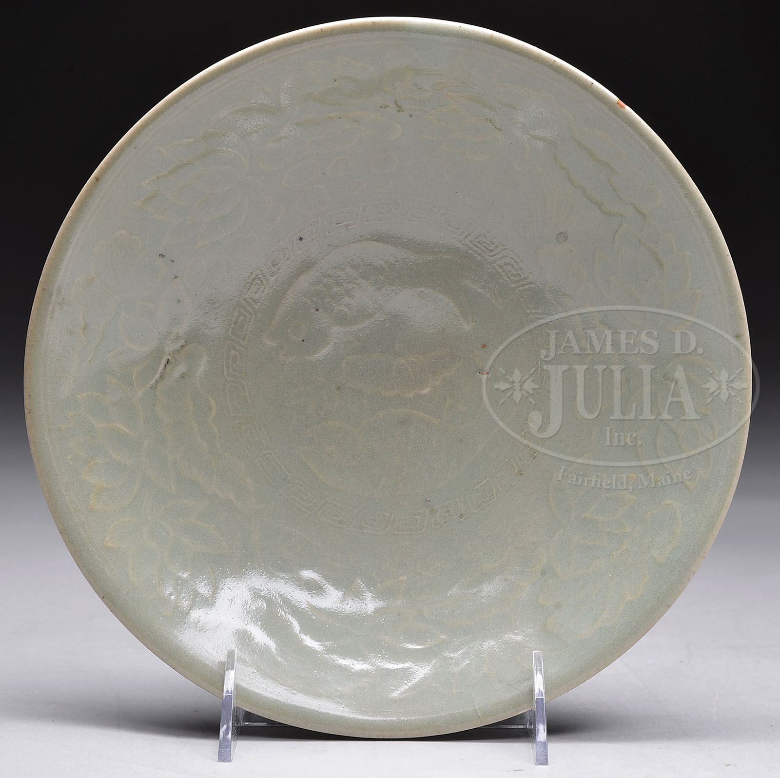CELADON BOWL. 18th century, China. Molded decoration of fish and lotus with a sea green glaze. SIZE: 8-3/4″ dia x 2″ h. CONDITION: Good overall. 7-73718 (200-300)