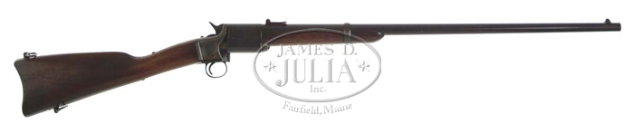 TRIPLETT & SCOTT CIVIL WAR CARBINE. Cal. 50 RF. SN 746. Usual configuration with 30″ rnd bbl, pinched blade front sight & carbine ladder rear sight. Left side of receiver marked “KENTUCKY” which indicates that it was made for the Kentucky Home Guard in a contract of only 3,000 pcs. Wood is straight grain walnut with rounded forearm, sgl band & straight grip with carbine buttplate. It has the unusual feature of sling swivels on top & bottom. This is a 7-shot repeater that operates from a magazine tube located in the left side of the stock & is operated by depressing a release button by the hammer & rotating the bbl to the right which ejects the fired casing and continues on to reload a new cartridge from the magazine. CONDITION: Very fine. Bbl retains about 95% blue turning plum. Receiver retains 25-30% case colors with the balance turning silver. Stock has a crack over the magazine tube area, otherwise the wood is sound and retains most of its orig finish with light handling & storage marks. Crisp mechanics, bright shiny bore with scattered light pitting. 5-60333 JR57 (1,500-2,500)
