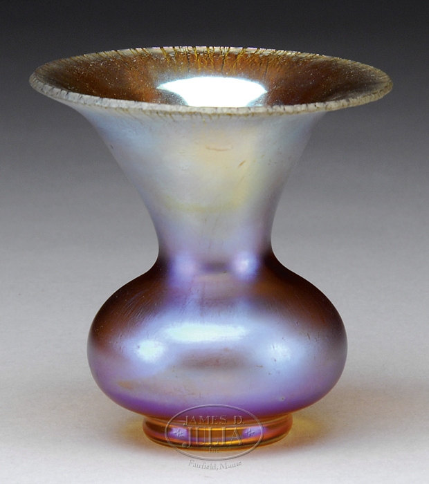 GOLD IRIDESCENT ART GLASS VASE. Iridescent vase is bulbous in shape with a wide stretched flared top. Unsigned. “756”. SIZE: 4″ t. CONDITION: Very good to excellent. 5-65198 (300-500)