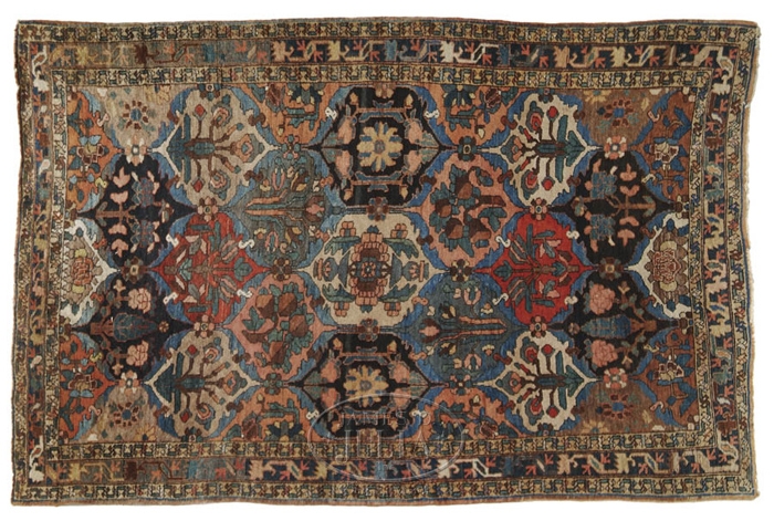 COLORFUL SCATTER SIZE ORIENTAL RUG. Multiple border with flower medallions in a colorful field. First half of the 20th Century. SIZE: 6’10” x 4’7”. CONDITION: Generally very good with consistent wear. End fringe missing with some fraying. 9-28854 (400-800)