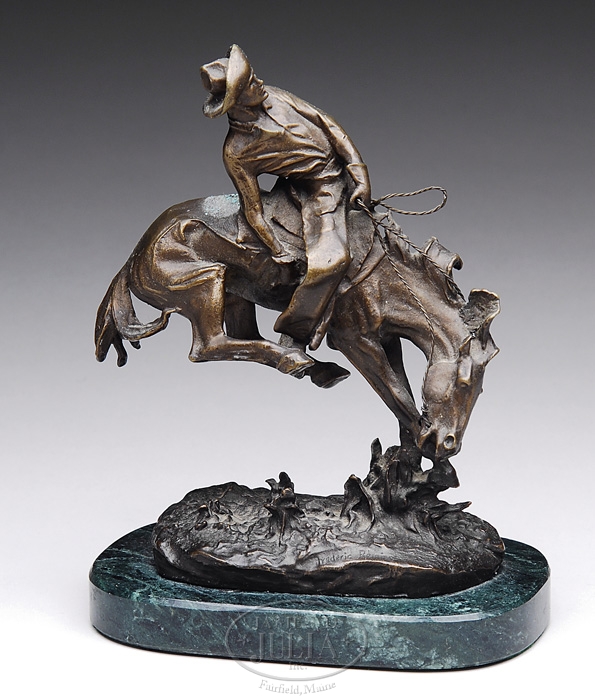 AFTER FREDERIC SACKRIDER REMINGTON (American, 1861-1909) “THE OUTLAW”. Small recast bronze depicting a cowboy on a rearing horse mounted to an oval green plinth. Late 20th Century. SIZE: 7″h, 8″ including base. PROVENANCE: Collection of Elwyn Dearborn, Medford, NJ & Portland, ME. CONDITION: Very good. 9-96011 (100-200)