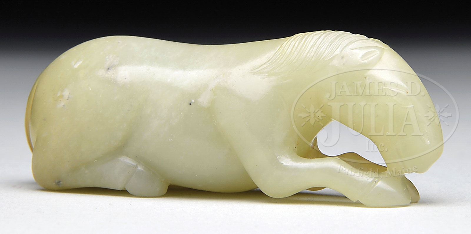JADE CARVING. 19th century, China. Stone of a celadon color with a large yellow area. Carving of a resting horse. SIZE: 2-1/2″ l. CONDITION: Very good. 7-73944 (600-800)