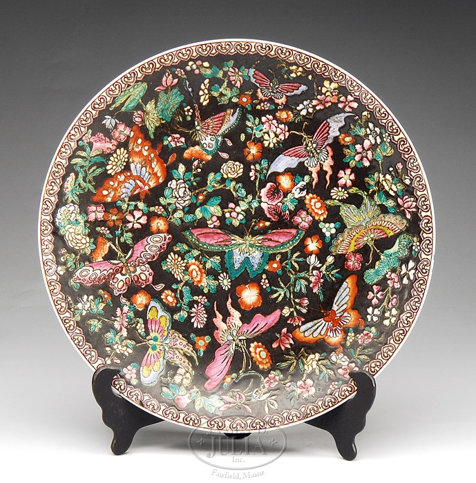 HEAVY ENAMELED ORIENTAL CHARGER. 20th Century charger has heavy decoration of butterflies and flowers against a black background. Block signature on base along with a wax seal with ribbon. SIZE: 15-3/4″ dia. PROVENANCE: Collection of Elwyn Dearborn, Medford, NJ & Portland, ME. CONDITION: Very good. 9-96177 (100-200)