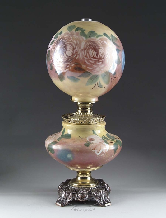 LARGE PARKER PAINTED GONE WITH THE WIND LAMP. Beautiful floral painted body and shade with cast iron base and brass font with brass font holder. Overall 27-1/4” high and has been electrified. The top shade has been repainted. CONDITION: Very fine. Top shade retains most of its fine restored finish and the bottom about 90% of its orig paint. Cast iron is a cleaned metal color. 5-60536 JR812 (250-450)