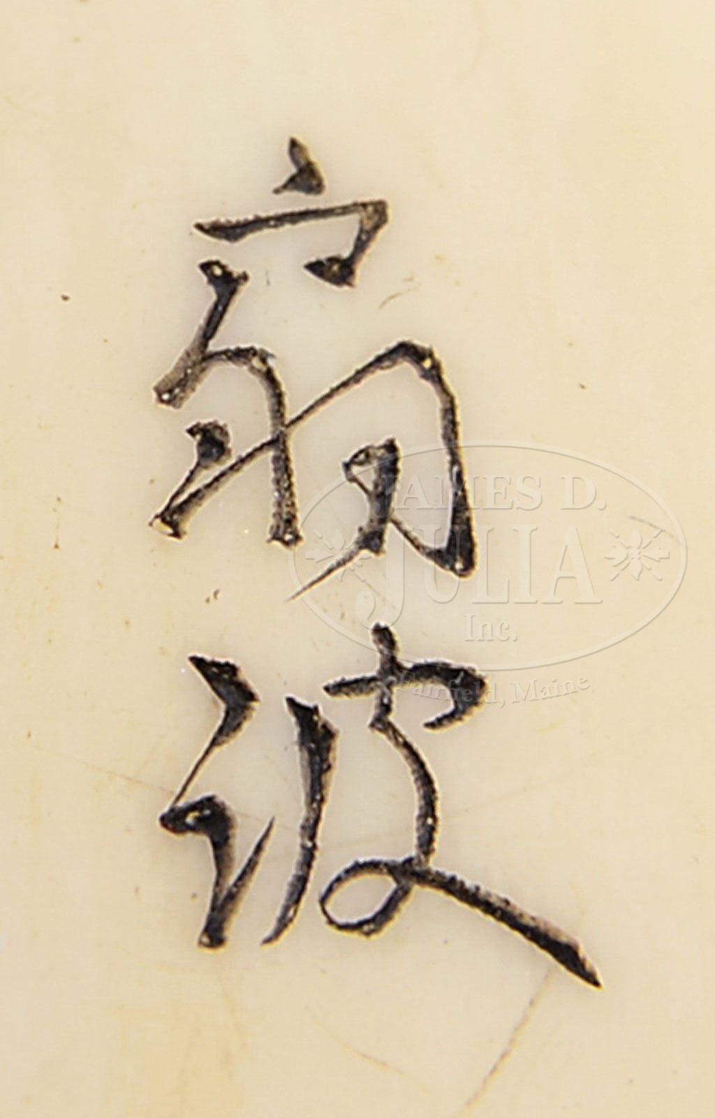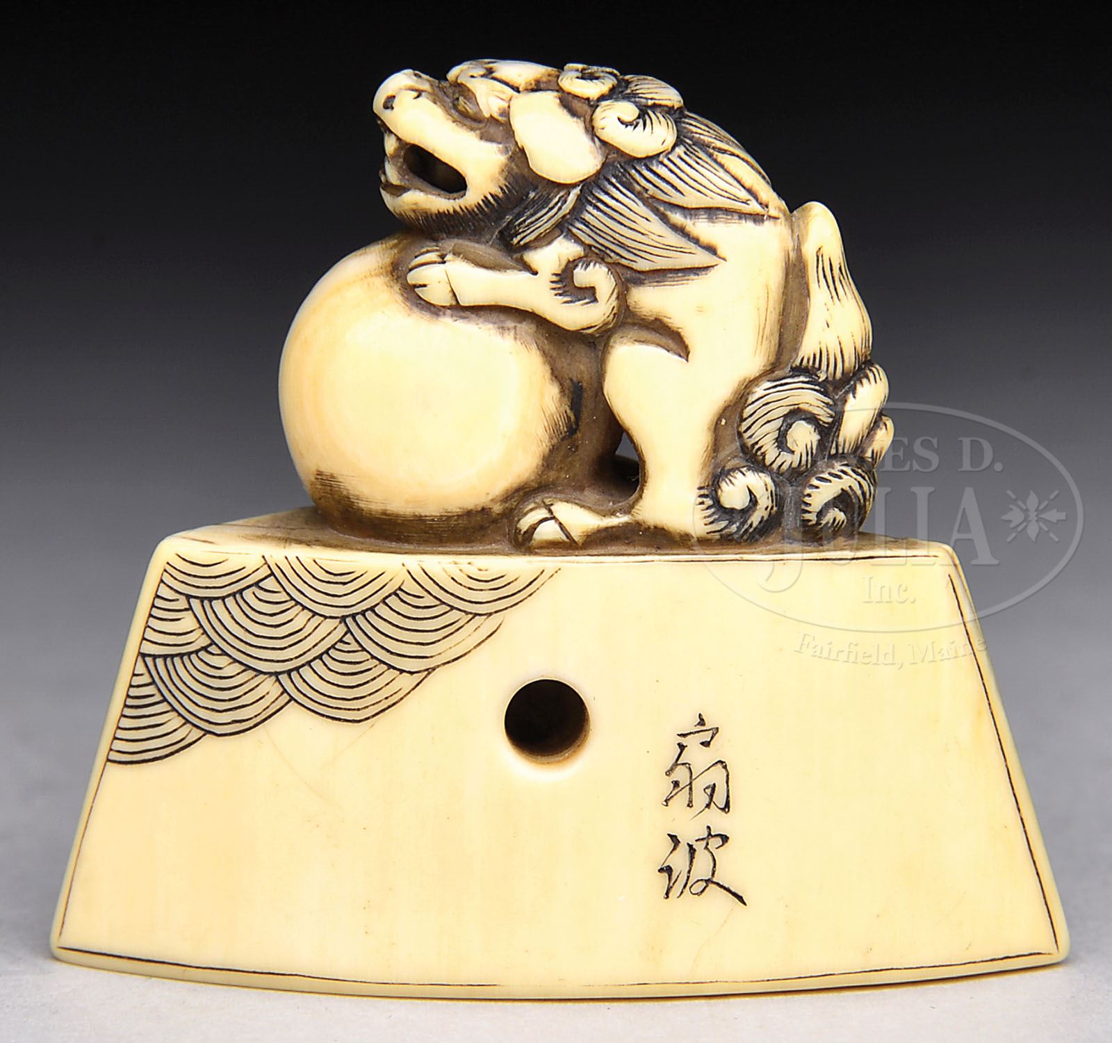 IVORY TOGGLE. 18th century, Japan. Netsuke of a shishi with a sphere on a triangular block. Signed on side. SIZE: 1-3/4″ l. CONDITION: Good patina with undisturbed surfaces. Vertical hairlines. 7-74082 (200-300)