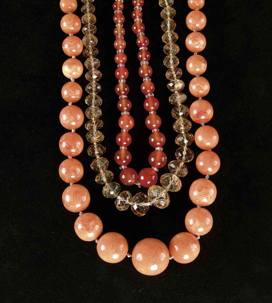 LOT OF THREE AMBER BEAD NECKLACES. 1) 32” strand of graduated size honey amber beads strung on a cloth cord and knotted between each bead. 2) 22” strand of graduated size faceted light amber beads with barrel clasp. 3) 14” strand of dark amber beads, each separated by a crystal wafer. CONDITION: Very good to excellent. 5-71939, 5-71940, 5-71941 (50-100)