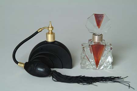 TWO ART DECO SCENT BOTTLES. 1) Art Deco design scent bottle features ruby flashed triangular panels to center of bottle and stopper. Bottle has hallmarked sterling silver collar. SIZE: 5” t. CONDITION: Chip to bottom edge of bottle, fleabites to edge of stopper, otherwise good. 2) Black satin glass Deco atomizer. Wonderful design consists of four overlapping half circles. Atomizer top is a gold colored metal with black hose and ball. SIZE: 4” t. CONDITION: Very good to excellent. 5-68048-663 (100-300)