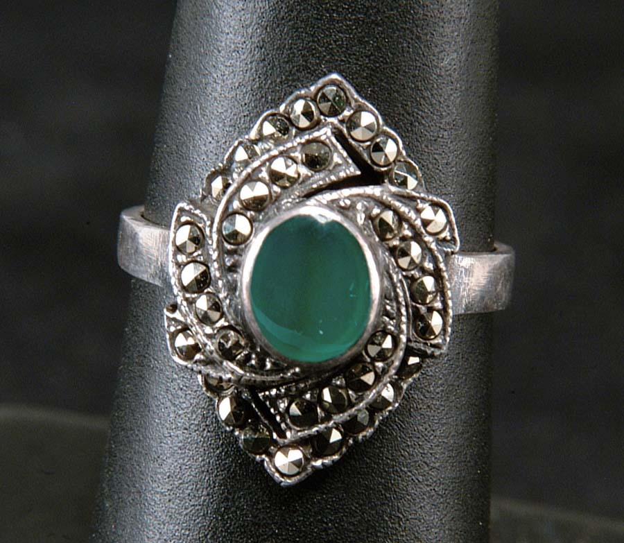 TWO PIECES OF ANTIQUE JEWELRY. 1) Beautiful sterling silver and marcasite ring is set with a center oval of green chrysoprase. The center ovals are surrounded by swirls of marcasite. SIZE: Ring is 3/4” x 1/2”. CONDITION: Very good to excellent. 2) An anchor brooch. The body of the anchor is carved from deep amber colored stripped agate and fitted with silver mountings at top and bottom and a silver rope encircling the anchor. SIZE: 2-1/4” t x 1” w. CONDITION: Very good to excellent. 5-71935, 5-71937 (50-100)