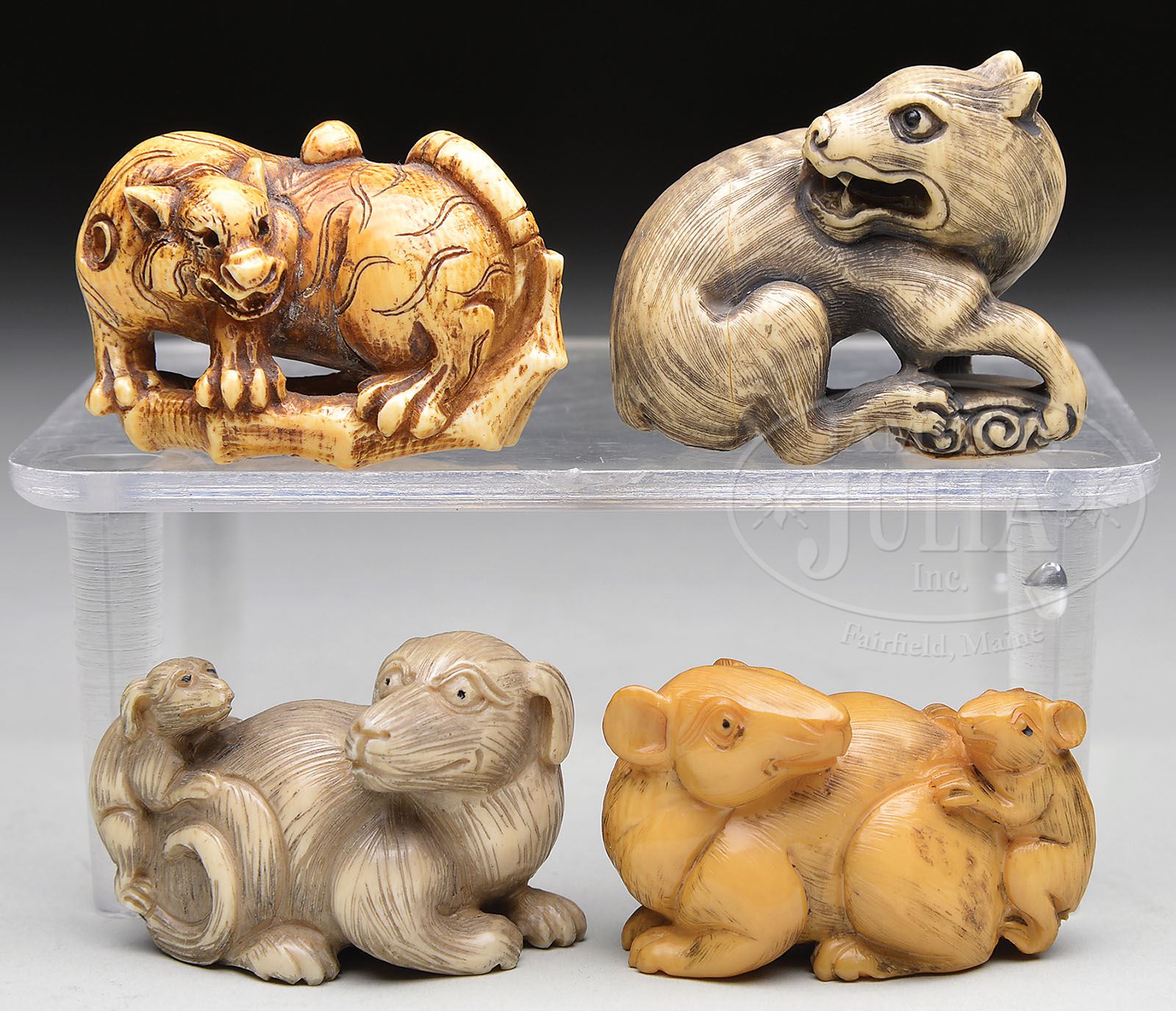 FOUR IVORY NETSUKE. Japan. Figures of various animals. SIZE: Each approx. 1-1/2″ l. CONDITION: Very good. 7-73817 (200-300)