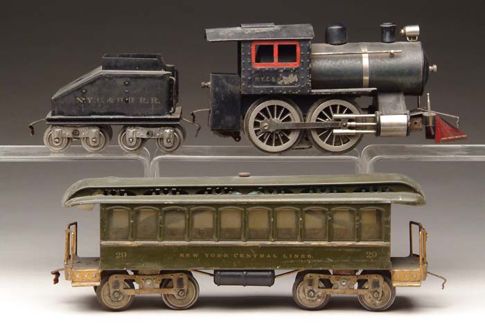 LIONEL STANDARD GAUGE #5 LOCOMOTIVE WITH SLOPE BACK TENDER & #29 DAY COACH. Engine is black with red window trim. Has pedestal headlight and short crinkle coupler and original flag post and pilot. Wooden steam dome intact and in nice condition. Cab is lettered “N.Y.C & H.R.R.R.” Tender is nice little sloped back example lettered “N.Y.C. & H.R.R.R.” on both sides. Also includes olive green day coach #29 with gold pin striping, clearly lettered “New York Central Lines” and embossed on the bottom “Lionel MFG Co. NY”. CONDITION: Engine mechanism is clean. Nice bright drivers and other nickel trim. Overall bluing of boiler is very good. Wooden boiler front and black wooden bulkhead intact. Long attaching screw is in place. Tender roof is in very good condition. Day coach has some paper marks, very few nicks or scratches. Minor surface rust on bottom edge of car, overall very good plus. EC 1-6492 (800-1,000) Auction: Advertising, Toy & Doll - Fall 2006 Please Note: All prices include the hammer price plus the buyer’s premium, which is paid by the buyer as part of the purchase price. The prices noted here after the auction are considered unofficial and do not become official until after the 46th day. |