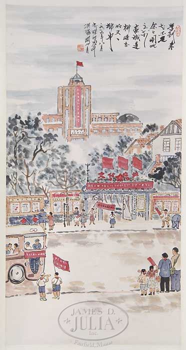 HANGING SCROLL, CHINA, ATTRIBUTED TO GUAN SHANYUE (1912-2000). Ink and color on paper, depicting a scene of children in Beijing Wenhua Square. Inscribed, signed, “Hanyang Guan Shanyue,” with two seals, dated year 1989. SIZE: 40-1/4″ x 21″. CONDITION: Good. 7-72810 (500-700)