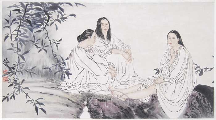 HANGING SCROLL, CHINA. 20th Century. Ink and color on paper, finely depicting three ladies resting next to a creek. Signed, with two seals. SIZE: 19-1/4″ x 35-1/4″. CONDITION: Good. 7-72812 (400-600)