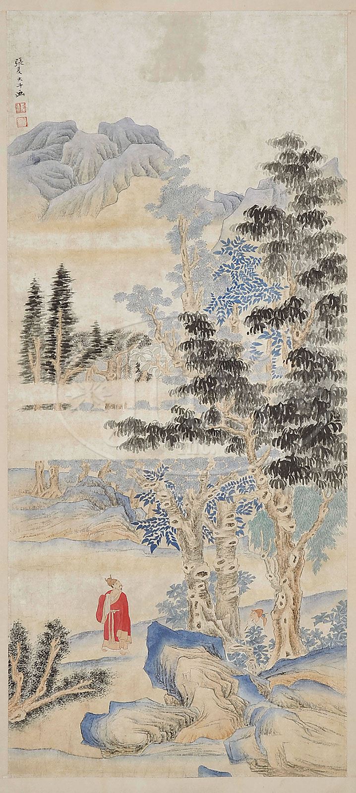 TWO HANGING SCROLLS, CHINA, IN THE MANNER OF ZHANG DAQIAN. Ink and colors on paper, one depicting a recluse and his attendant in a lush landscape, signed “Zhang Yuan Daqian,” with two seals, the other depicting a scholar boating in a Xiaoxiang area, inscribed, dated the sixth month of wuzi year, signed “Daqian jus hi Zhang Yuan,” with two seals. SIZE: 35-1/4” x 15-1/2”, 35-1/2” x 18”. CONDITION: Both in good condition. 9-28875 (500-700)