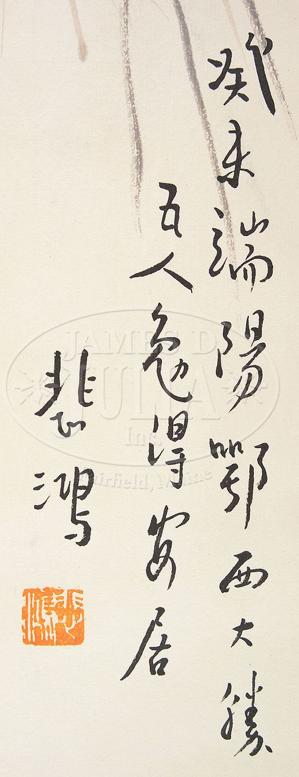 HANGING SCROLL, CHINA, IN THE MANNER OF XU BEIHONG. Ink and light colors on paper, vividly depicting a galloping horse, inscribed, dated guiwei year, signed “Beihong,” with one seal. SIZE: 37-1/2” x 18”. CONDITION: Good condition. 7-73867 (400-600)