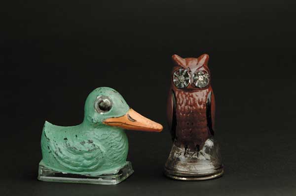 LOT OF 2 BIRD CANDY CONTAINERS Includes Ugly Duckling and Owl. Turquoise Duck (L.E. Smith Co.) has long bill and bulging eyes atop oblong base (missing closure). Brown Owl, ca. 1920, has rhinestone eyes with black and white highlights. Stands atop round tree branch base with gold tone screw-on closure. SIZE: Tallest is 4 1/2″ t. CONDITION: Generally very good with strong paint. 1-29895-526 (150-250) Auction: Advertising, Toy & Doll - Spring 2003 Please Note: All prices include the hammer price plus the buyer’s premium, which is paid by the buyer as part of the purchase price. The prices noted here after the auction are considered unofficial and do not become official until after the 46th day. |