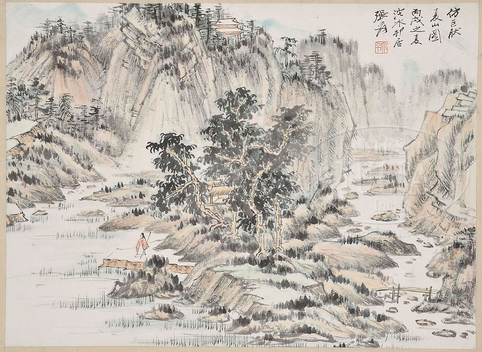 SET OF FOUR PAINTED LEAVES, CHINA, IN THE MANNER OF ZHANG DAQIAN. Ink and colors on paper, each depicting a recluse in a verdant landscape engaged in activities, inscribed, signed “Daqian Yuan,” with seals. SIZE: 11-1/2” x 15-1/2”. CONDITION: Good condition. 9-28985 (400-600)