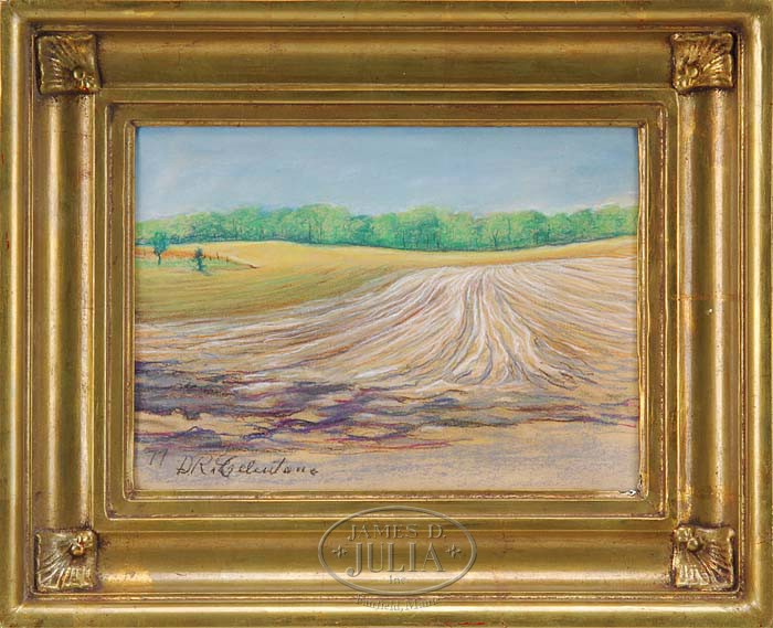 DANIEL RALPH CELANTANO (American, 1902-1980) FIELDS AND TREES. Pastel on paper scene shows a field area leading to water with a line of trees bordering a golden field. Signed lower left and dated “77”. Housed in a modern gilt decorated frame. SIZE: Sight: 10-1/4″ x 14-1/4″. PROVENANCE: Estate of the artist. CONDITION: Very good. 9-94353 (400-600)