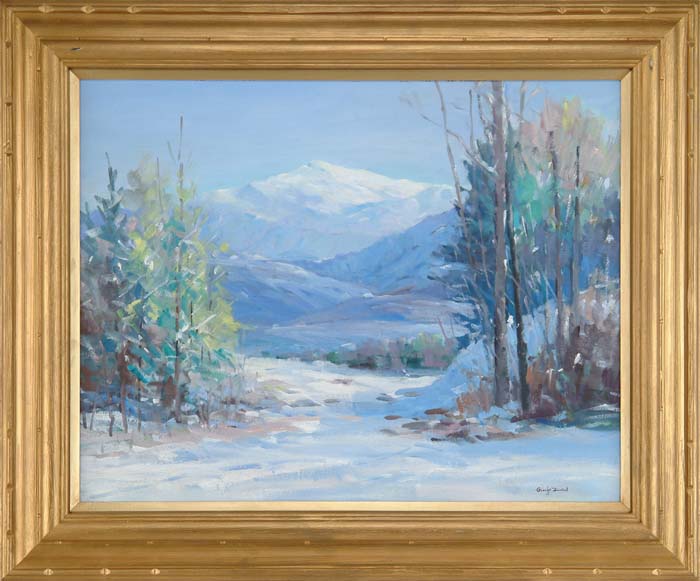 GEORGE WILLIAM DINCKEL (American, 1891-1976) “EARLY SNOW AT BRETTON WOODS”. Oil on masonite winter New England landscape shows a snow covered Mt. Washington from the valley below. Signed lower right. Housed in a gold painted carved molded wood frame with gold liner. SIZE: 22” x 28”. CONDITION: Very good. 9-72175 (400-800)