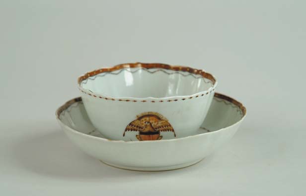 ORIENTAL EXPORT LARGE CUP AND SAUCER. Each with spread wing eagle and shield. Fancy inside rim border with an outside dart border. Shaped top. SIZE: Saucer is 1-1/2” h x 6” dia. Handless cup is 2-1/4” h x 4-1/4” w. CONDITION: Very good. 9-96358 (300-500)