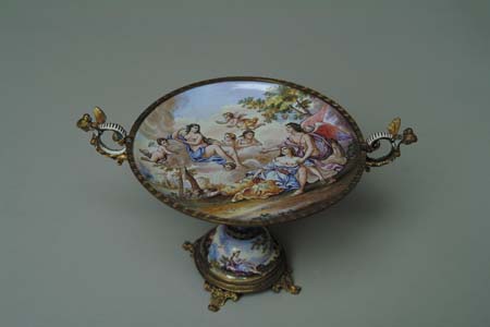 ENAMELED & BRASS COMPOTE. Center of compote consists of enamel design of angles holding a dying woman in pastoral scene. Compote has two handles in the form of a winged maiden with enameled wings and decoration. Underside of bowl is enameled with trees, fields and castles while stem and base feature maidens in wooded scenes. SIZE: 8” w at the handles x 4-3/4” t. CONDITION: A chip and some cracking to the underside of the bowl, otherwise very good. 5-69333 (400-600)