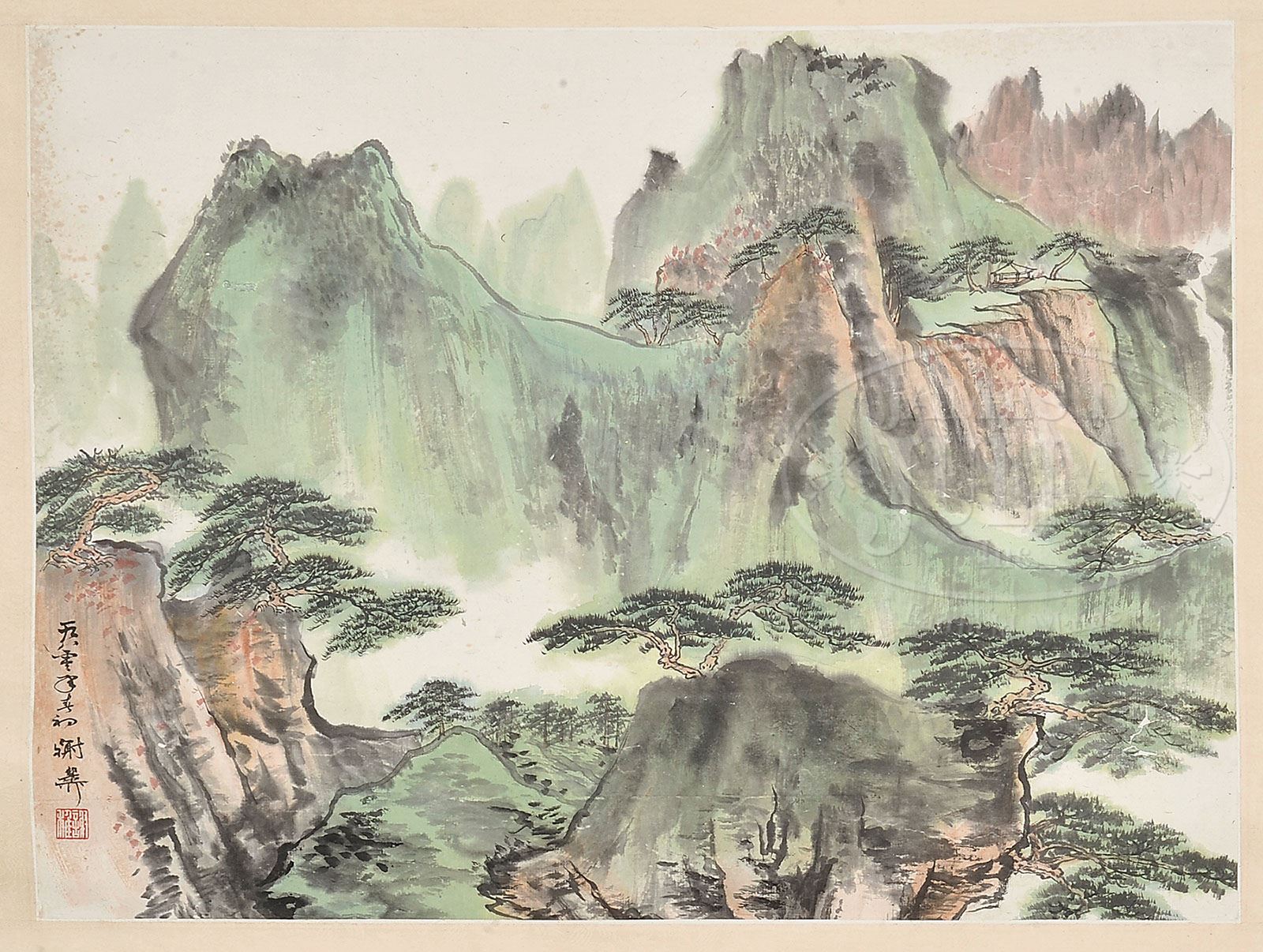 HANGING SCROLL, CHINA, IN THE MANNER OF XIE ZHILIU. Ink and color on paper, depicting a verdant landscape with mountains and pines, dated 1980, signed, with one seal. SIZE: 13” x 17-3/4”. CONDITION: Good condition with slight foxing. 9-28914 (300-400)