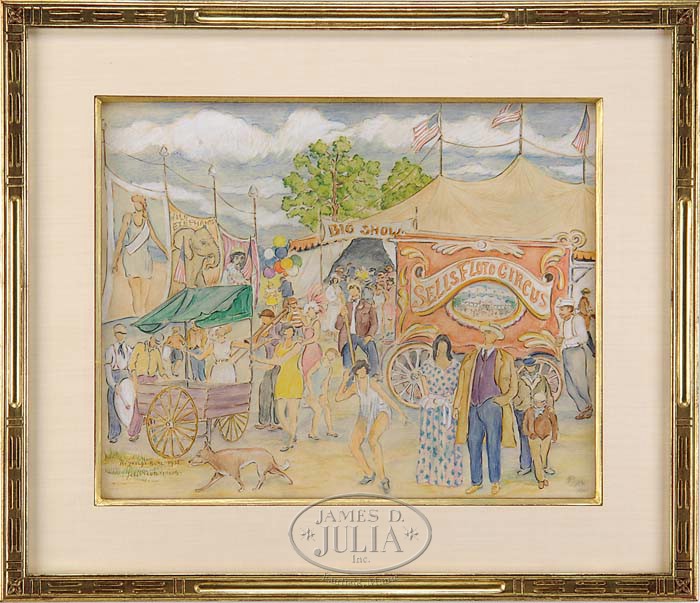 REYNOLDS BEAL (American, 1867-1951) “SELLS FLOTO CIRCUS, 1928”. Mixed media circus scene shows a set up circus with a big top, circus wagons, banners and vendors with all of the performers present. Signed lower left “Reynolds Beal, 1928 Sells Floto Circus”. Housed in a fine carved an gilt modern frame with silk matte and inner gold liner. SIZE: Sight: 14-1/2″ x 18-1/4″. CONDITION: Very good. 9-95454 (5,000-7,000)