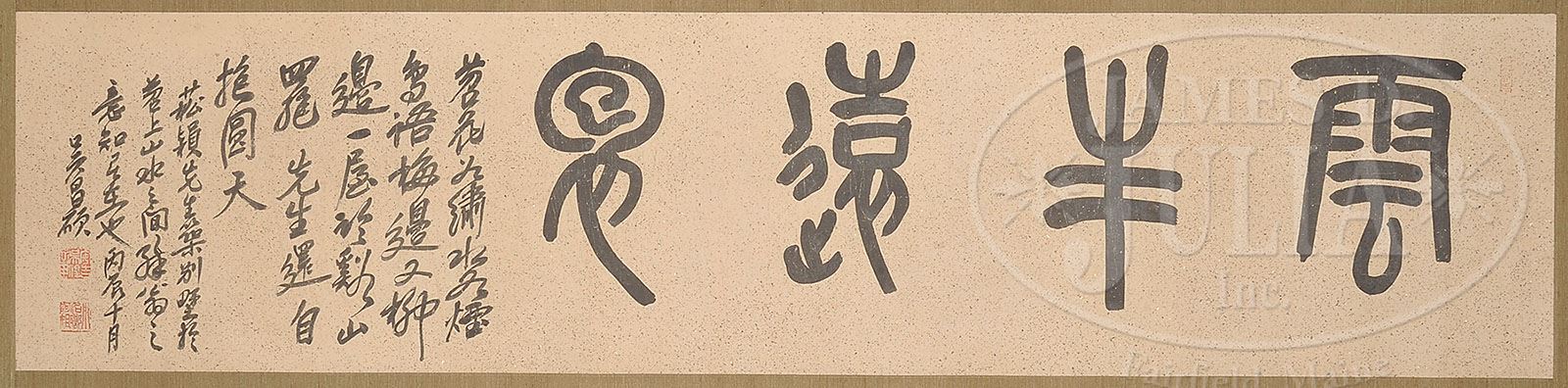 LOOSE CALLIGRAPHY, CHINA, IN THE MANNER OF WU CHANGSHUO. Calligraphic writing in seal script on gilt paper, inscribed, dedicated, dated the tenth month of bingchen year, signed “Wu Changshuo,” with two seals. SIZE: 12-1/4” x 52”. CONDITION: Good condition. 9-28902 (250-350)