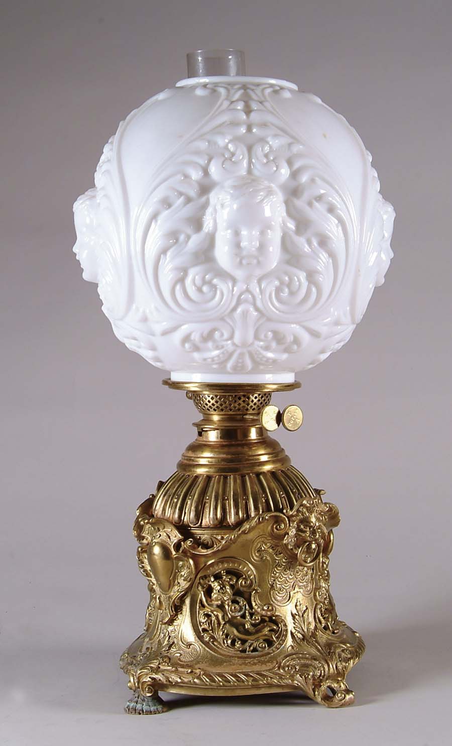ORNATE BRASS KEROSENE LAMP. Rare kerosene lamp has very ornate cast brass body with open work panels featuring cupids among floral sprays. Brass feet alternate between a stylized shell design and a classic scroll design and give way to a high relief scroll and leaf design running up the body of the lamp. Top of cast body is highlighted with lion’s heads and high relief shields. Brass font has vertical ribbed design on shoulder and gives way to a duplex burner. Wick knobs are marked “Duplex PA”. Lamp is finished with a white milk glass ball shade with high relief children’s faces within a swirling leaf design. SIZE: 20″ t to top of shade. CONDITION: One burner attachment lip is missing and a few very minor chips to top and bottom rim of shade, otherwise very good. 5-71040 (1,200-1,500)