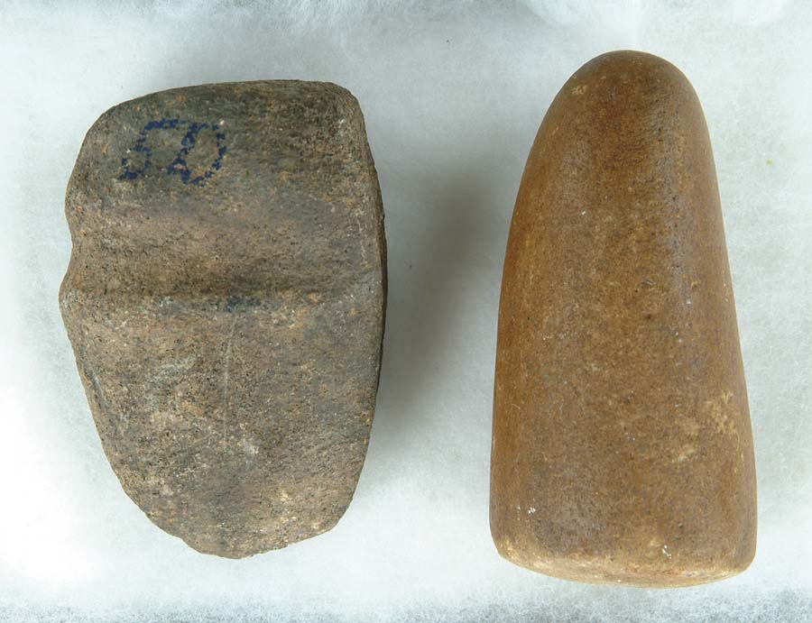 TEN ROUND STONE TOOLS. Archaic to early Woodland, Circa 6000BC style-500AD style. Three 3/4 grooved axes, five full grooved axes, one conical pestle, one roller pestle. Materials range from slate, diabase, rhyolite to quartzite. SIZE: Largest is 8” l x 4” w; smallest if 4” l x 3” w. CONDITION: Poor to very good. 9-25984-95 The Tennessee Collection of Prehistoric Indian Artifacts from the Allen Graves Estate. SPECIAL NOTE: We do not regularly sell Prehistoric Indian stone artifacts and therefore have very little experience and no expertise in this area. All of the following lots have come from the Collection of the Late Allen Graves of Tennessee. The collection was inherited some years back by his daughter, who now lives in Maine. This collection was consigned to us directly from her. We employed someone to generally identify styles and types, but as stated above, due to our lack of expertise in this field, we can not guarantee the age or origin of the following pieces. We are relying on you, the buyer, to determine to your satisfaction the origin and age of each item in the collection. (250-350)