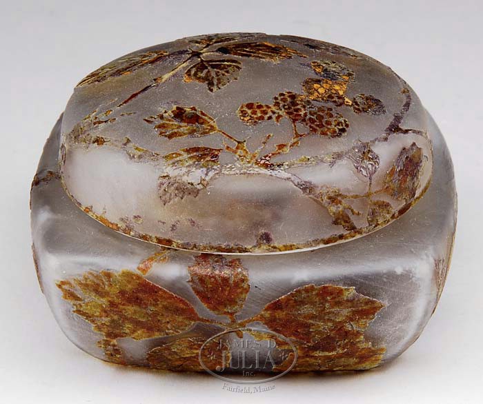 DAUM CAMEO BOX. Beautiful Daum box has vitrified brown and green cameo decoration of leaves, stems, and raspberries against a frosted and acid-textured background. The pattern carries seamlessly from box to lid. Signed on side of box in cameo “Daum Nancy” with the cross of Lorraine. SIZE: 4″ sq. CONDITION: Very good to excellent. 5-67796 (1,500-2,500)