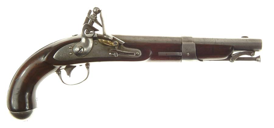 NORTH MODEL 1826 NAVY PISTOL. Cal. .54. 8-5/8″ rnd bbl. Dated “1827” on the tail of the lock. Marked “U.S. / S NORTH” on the lockplate in front of the hammer. The belt hook, hammer, frizzen and internal lock parts do not have inspector marks except the bridle screws which are mismatched, appears to be an old reconversion. The pan has not been finished and covers up the lower portion of the touchhole. CONDITION: Metal parts have been cleaned but some light pitting remains. Wood has been lightly sanded and refinished. Action is fine. From the collection of the late John Hamilton. 4-52124 (1,000-1,500)