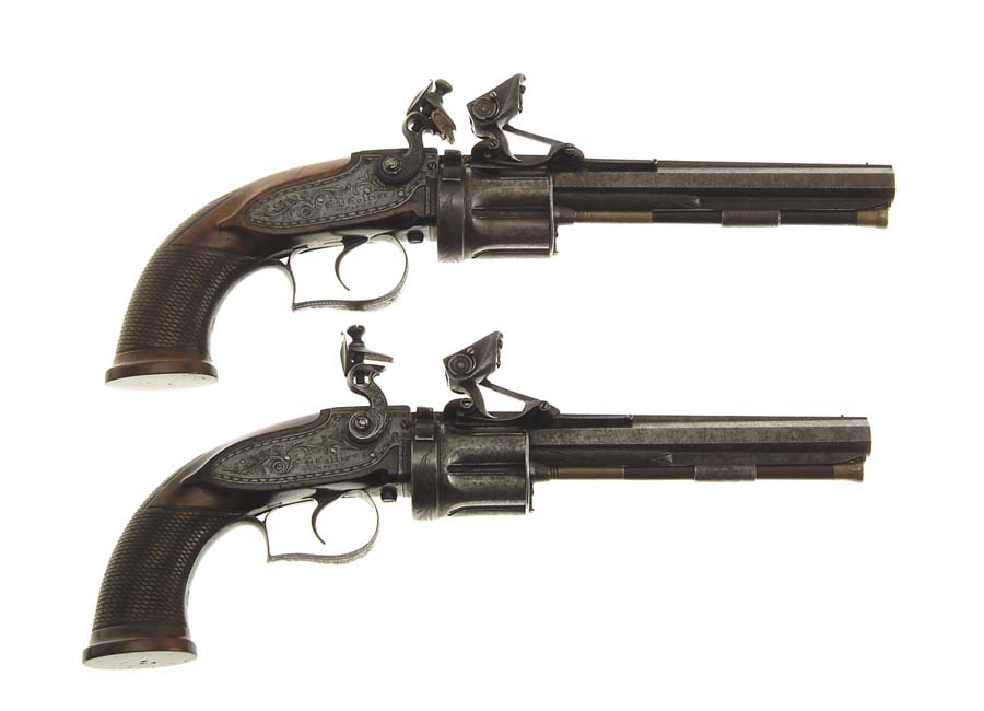EXTREMELY RARE PAIR OF MATCHING-NUMBERED COLLIER FLINTLOCK REVOLVING PISTOLS. SN 82. Cal. .48 smoothbore. 6-5/16” oct bbls with ribs. Both of these are the hand-revolved variety that is gas-sealed at the rear of the bbl when the hammer falls. The lockplate is marked in Old English script, “E.H.Collier 82 Patent” below the hammer & in front of panoply of arms. The top of the bbl is marked “E.H. Collier / 82 London.” There are rollers on both of the frizzens. The frizzens contain an automatically revolved powder rotor for priming the pans, worked by a spring-loaded lever operating on their left sides. There is a lid on top of the frizzen that can be turned to the side to load the powder chamber in each frizzen. The bbl, frame, lockplate, coverplate & priming chamber cover at the rear of the cylinder are all finely engraved. The rear of the iron rib under the bbl is checkered. The engraved flashguard is removed by pulling straight down. It covers the mouths of the four chambers not lined up with the bbl. The rosewood ramrods have turned brass ends. There is an engraved solid silver hunter’s star on the left side. The second pistol is identical except for the ramrod, which is an almost exact copy. These guns are usually identified with early Colt guns as they are a predecessor of modern (percussion) revolvers and are thought to have inspired a young Sam Colt duringa youthful voyage to England. Colt did have a Coloier in his personal collection at the time of his death. CONDITION: Extremely fine. 90% blue on the trigger guards, 50% on the top of the action. Faded case hardening on the lockplates. There is also blue on the frizzen springs and operating parts of the frizzen. Front of the flashguards has about 50% blue. Chambers & bbls appear to be unfired, as they are bright. No finish on the bbls but the Damascus pattern is strong. Some light pitting on the top strap in front of the cylinder. 4-53911 (125,000-150,000)