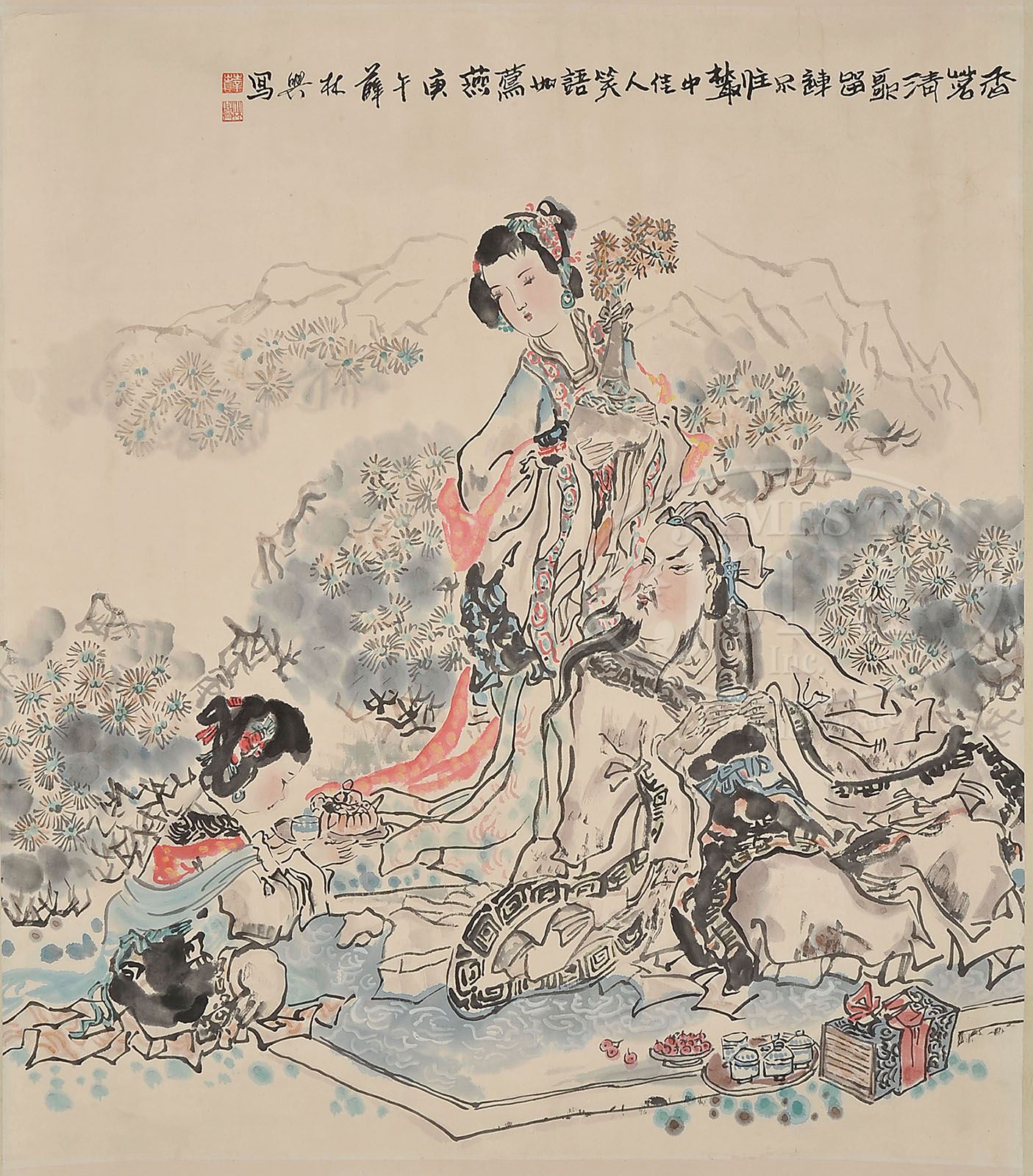 HANGING SCROLL, CHINA, ATTRIBUTED TO XUE LINXING (B. 1951). Ink and colors on paper, depicting an official and maids in a garden scene, inscribed, dated gengwu year, signed “Xue Linxing,” with two seals. SIZE: 37-3/4” x 33-1/4”. CONDITION: Good condition. 9-28889 (200-300)