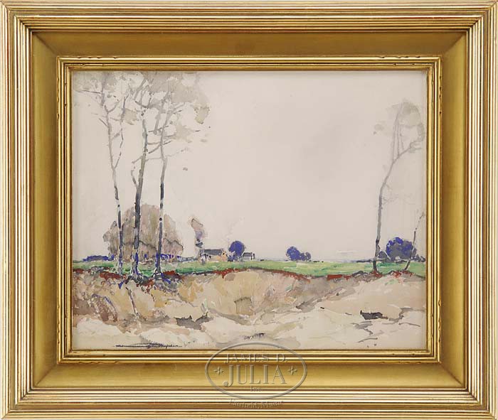 CHAUNCEY FOSTER RYDER (American, 1868-1949) TREES AND HOUSES. Watercolor scene shows a sandy bank with trees atop looking across to a farm and groups of trees. Signed lower left. Housed in a fine reproduction reeded and gilt frame with glass and inner carved gilt liner. SIZE: Sight: 14-1/4″ x 18″. CONDITION: Very good. 9-95482 (2,000-3,000)