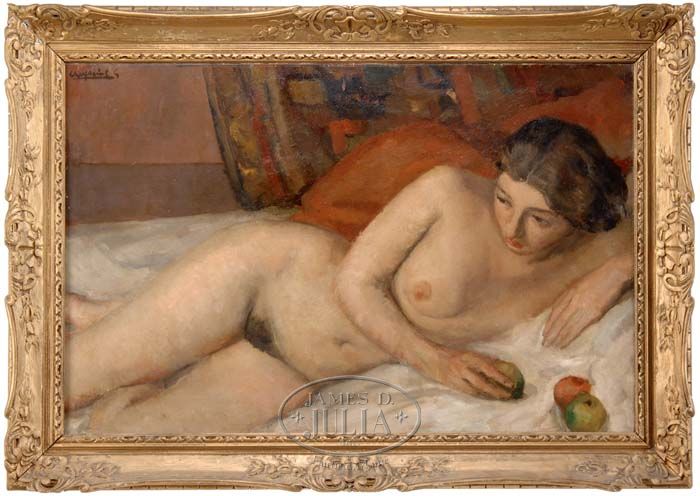 GEORGES ROBERT CHEYSSIAL (French, 1907) RECLINING NUDE WITH APPLES. Large oil on canvas interior scene shows a nude woman recumbent on a bed with white sheets and rust colored pillow. She holds one green apple and two other are beside her. Signed upper left “Cheyssial G”. Housed in its original carved wood gold frame. Attached to frame are three newspaper articles about the artist. PROVENANCE: Fine private Long Island, New York mansion. SIZE: 25-1/2” x 39-1/4”. CONDITION: Very good. 9-73992 MD (1,000-2,000)