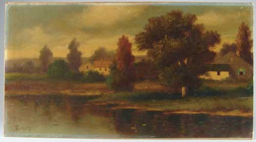 THOMAS BIRCH (American, 1779-1851) NEW ENGLAND LANDSCAPE. Oil on canvas mounted on cardboard scene shows two New England type houses near a body of water having lily pads. Several tall trees surround houses. Signed “T Birch” with a conjoined capitol T and capitol B. Housed in a replacement gilt molded wood frame. SIZE: 12” x 22”. CONDITION: Very dirty, in need of cleaning. Otherwise very good. 9-98991 (5,000-7,000)