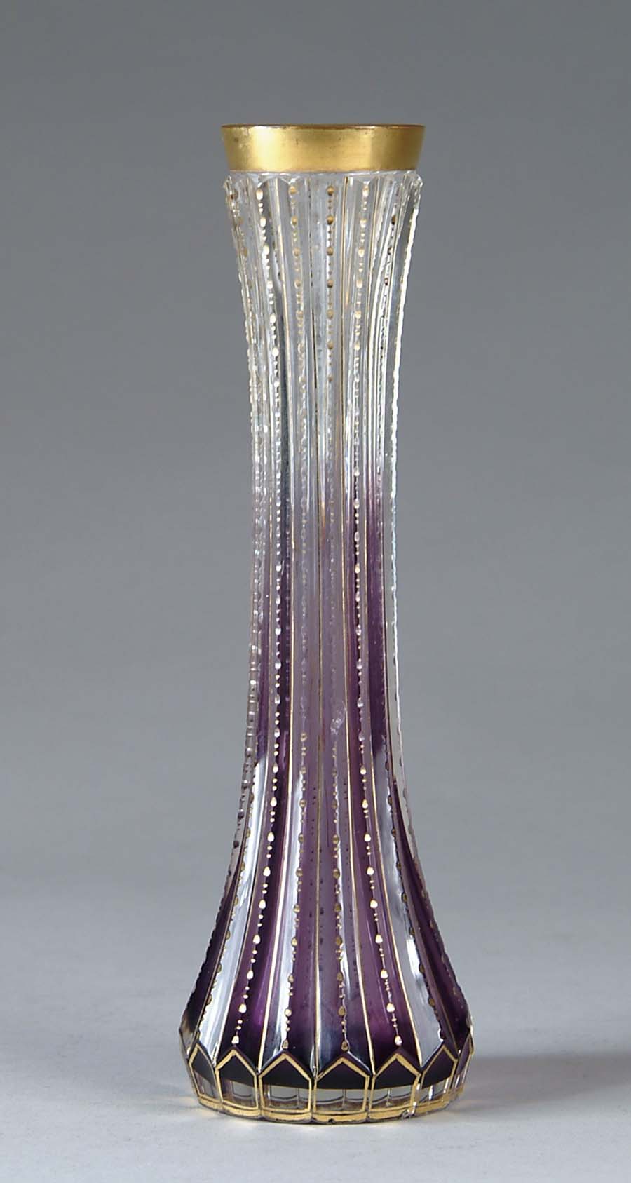 MOSER TYPE VASE. Amethyst shading to a clear cut vase with applied gold enameling, unsigned. SIZE: 9-3/8” t. CONDITION: Minor flakes to side and base. 5-71475 (100-200)