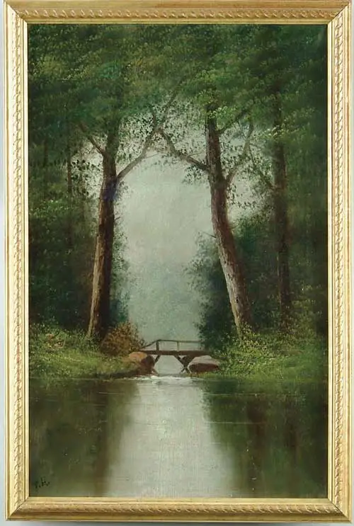 THOMAS HIRAMS HOTCHKISS (American, 1857-) THE RIVER BRIDGE. Oil on canvas summer scene shows a wooden bridge flanked by large rocks which has small river going into pond area. Opening through woods is framed by two large trees. Signed lower left “T. H.” Housed in a replacement gilt wood gesso decorated frame. SIZE: 22” x 14”. CONDITION: Two patches on reverse, restored with inpainting. 9-98974 (4,000-6,000)