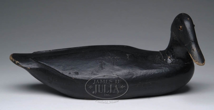 RARE GUS WILSON TURNED HEAD BLACK DUCK. Gus Wilson of South Portland, Maine is Maine’s foremost antique decoy carver. This scarce example with raised wing carving, glass inset eyes and turned mortised in head is an unusual example of his work. SIZE: 16” l. CONDITION: Old in use repaint. Head has a crack on one side with in use nail repair and some cracks at the base of the neck. Couple of small wear spots but otherwise generally very good. 9-29486 (1500-2500)