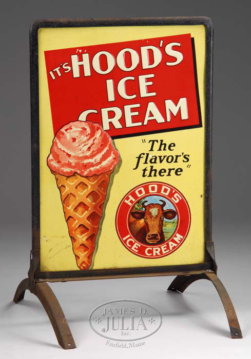 HOOD’S ICE CREAM SIDEWALK SIGN. Two embossed tin signs back-to back in their original steel sidewalk sign holder. SIZE: Overall 20-1/2″ w x 33-1/2″ h. CONDITION: Sign is good to very good; holder good with weathered surface. 1-7354 PF (600-1,000) Auction: Advertising, Toy & Doll - Spring 2007 Please Note: All prices include the hammer price plus the buyer’s premium, which is paid by the buyer as part of the purchase price. The prices noted here after the auction are considered unofficial and do not become official until after the 46th day. |